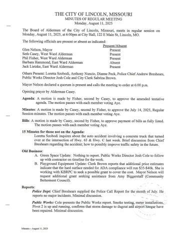 Or you can reach us at sabrina.brown@lincoln-mo.com or kerrie.casey@lincoln-mo.com. For utility EMERGENCIES (after hours), please call the Benton County Dispatch Center (660) 438-9555.